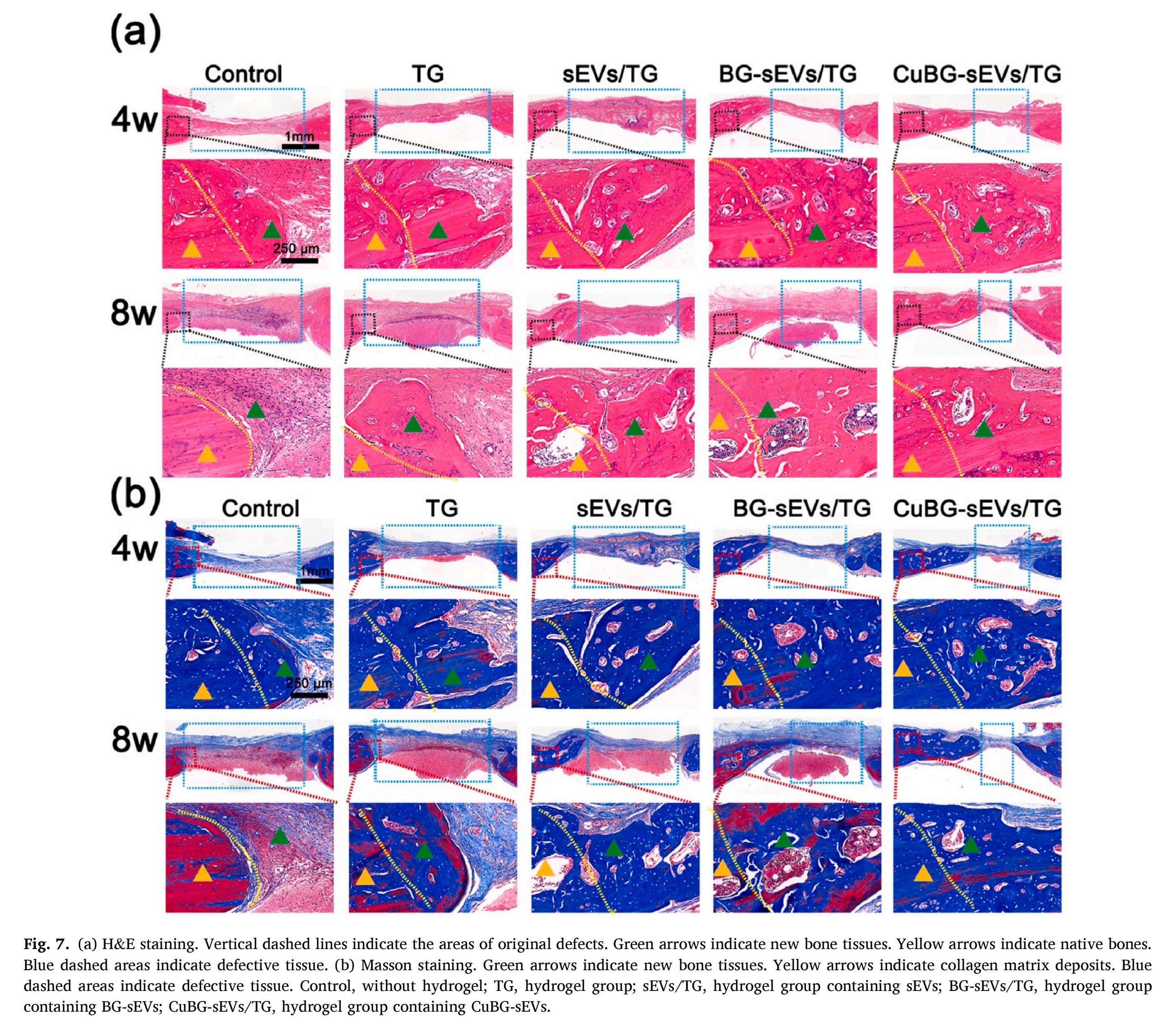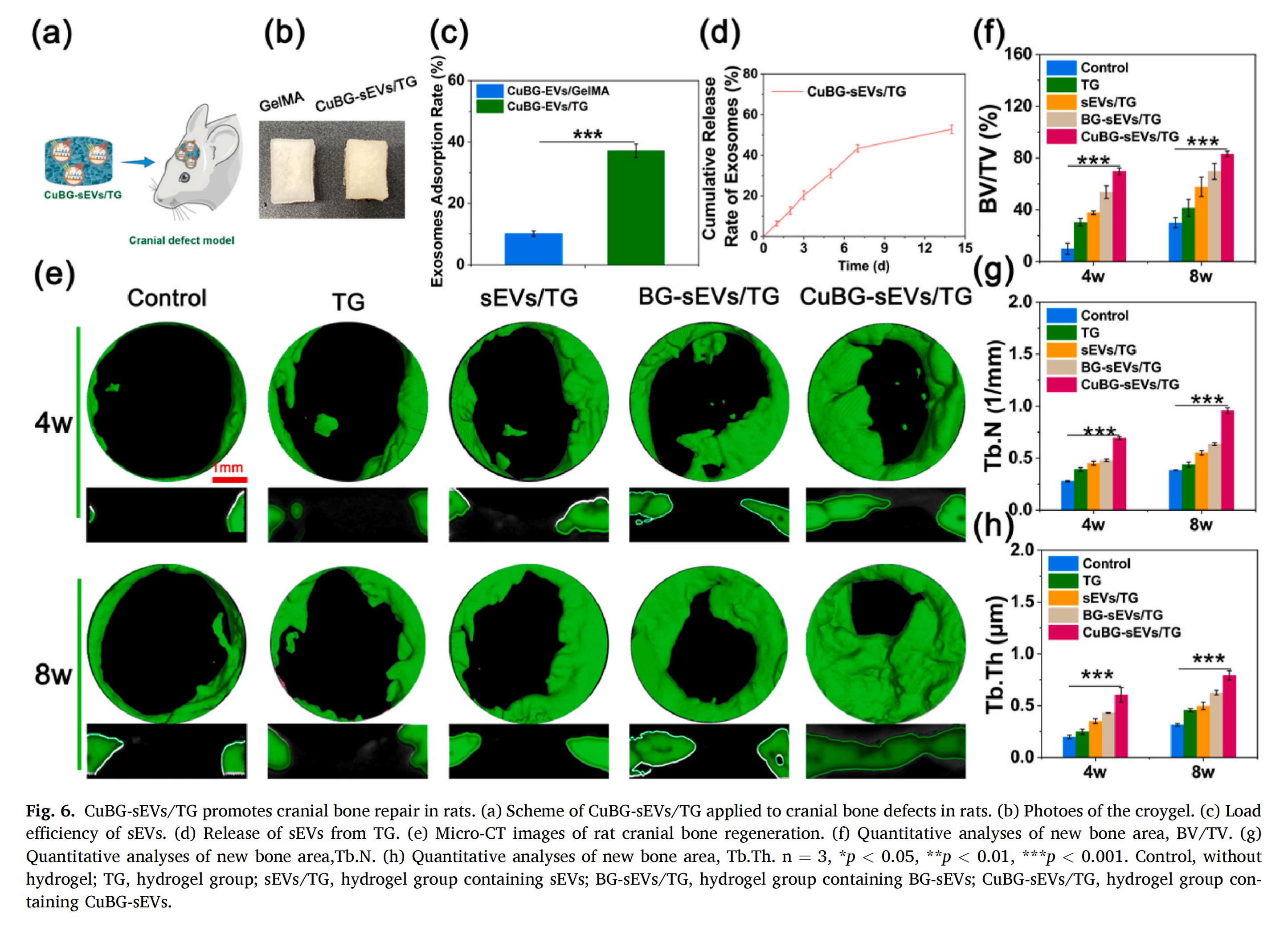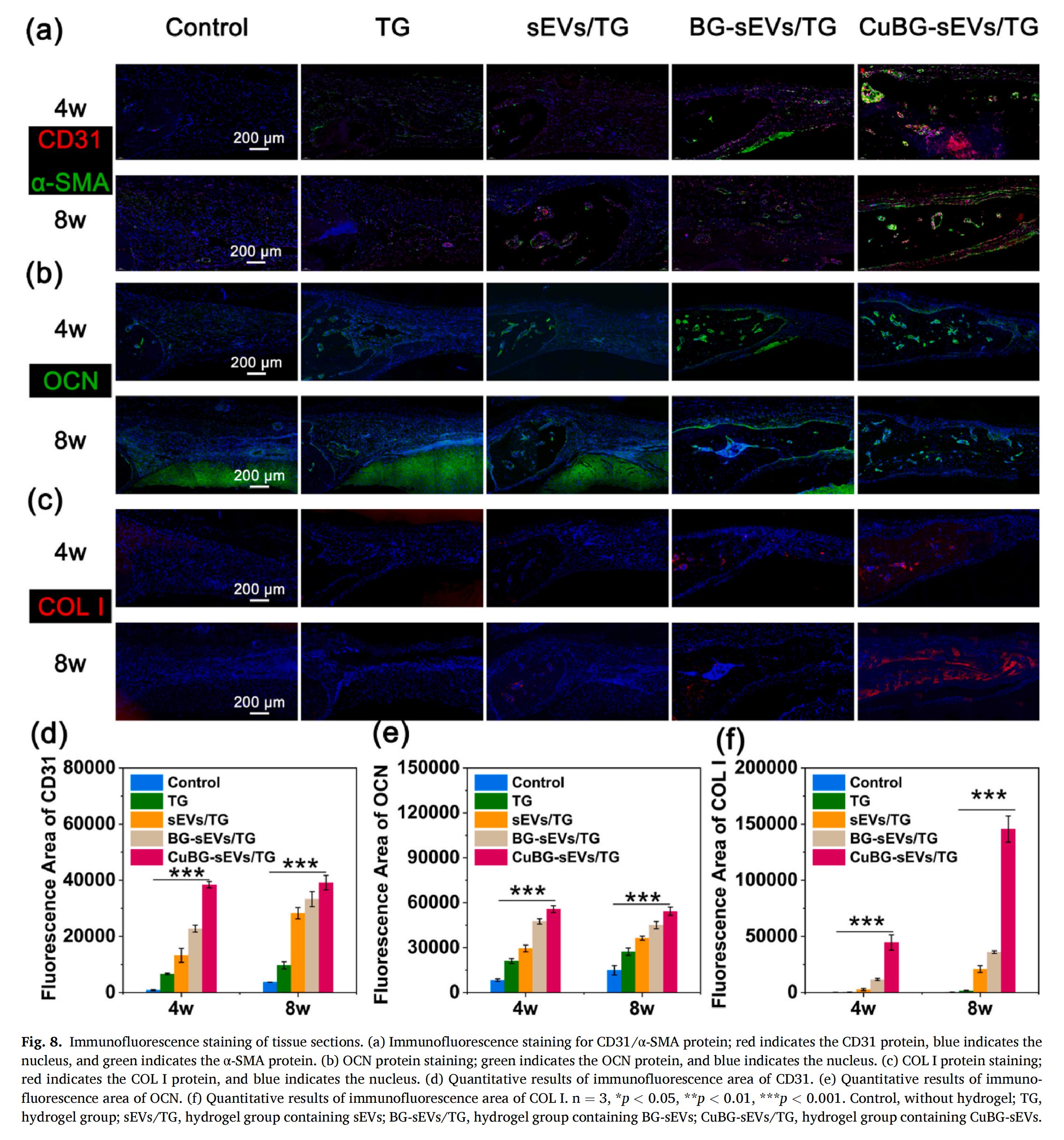 此外,將CuBG-sEVs與TG冷凍凝膠聯(lián)合應(yīng)用于骨缺損部位,CuBG-sEVs通過驅(qū)動細(xì)胞募集、血管生成與成骨分化這一核心機(jī)制,有效支持骨缺損的全面再生;該過程伴隨著加速血管生成與增強(qiáng)I型膠原沉積,從而顯著提高了修復(fù)效率。此項(xiàng)工作證實(shí)了sEVs作為BG替代方案的巨大潛力,為提升骨再生療效提供了新思路。