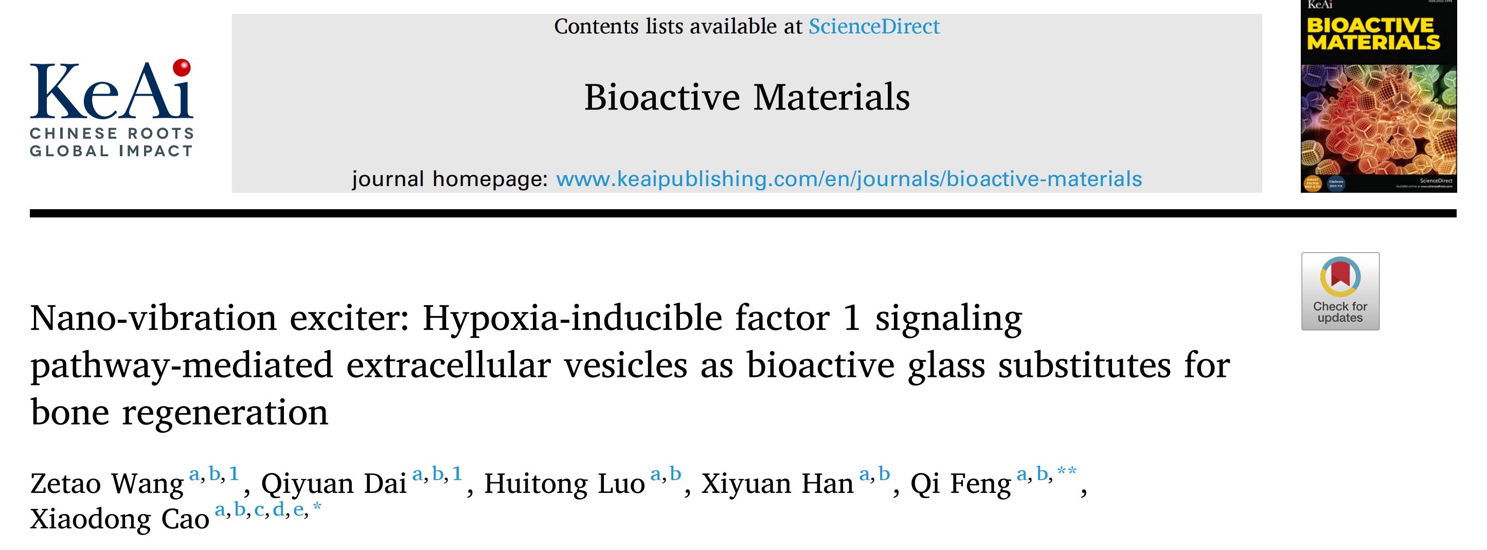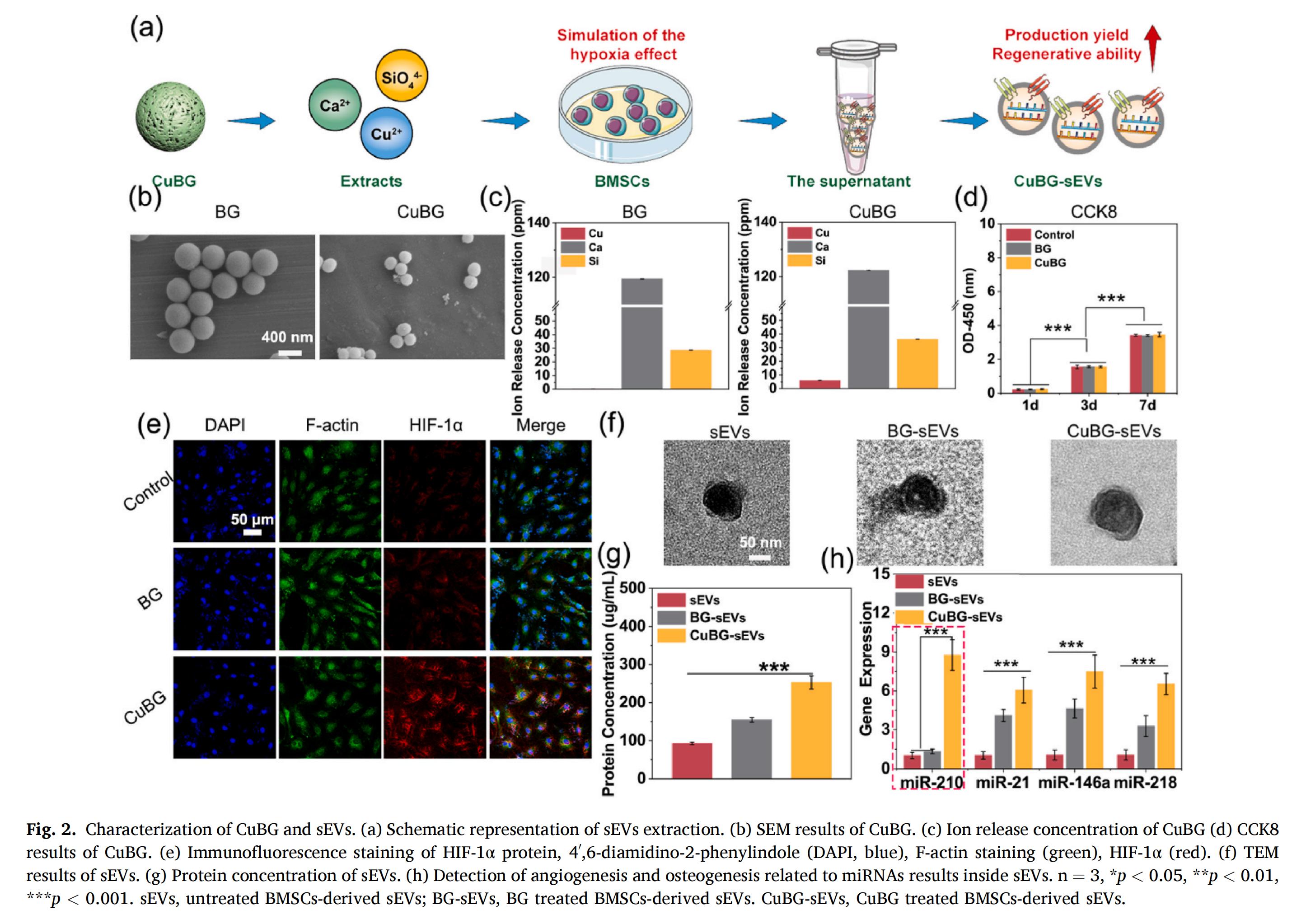 本研究采用CuBG處理BMSCs,制備出小型胞外囊泡(sEVs),并將其類比為納米振動激發(fā)器"(nano-vibration exciter)。通過激活HIF-1信號通路及其介導(dǎo)的自噬過程,將CuBG釋放的離子信號轉(zhuǎn)化為生化因子信號,從而更高效地發(fā)揮BG的成骨潛能,驅(qū)動組織的再生與修復(fù)。