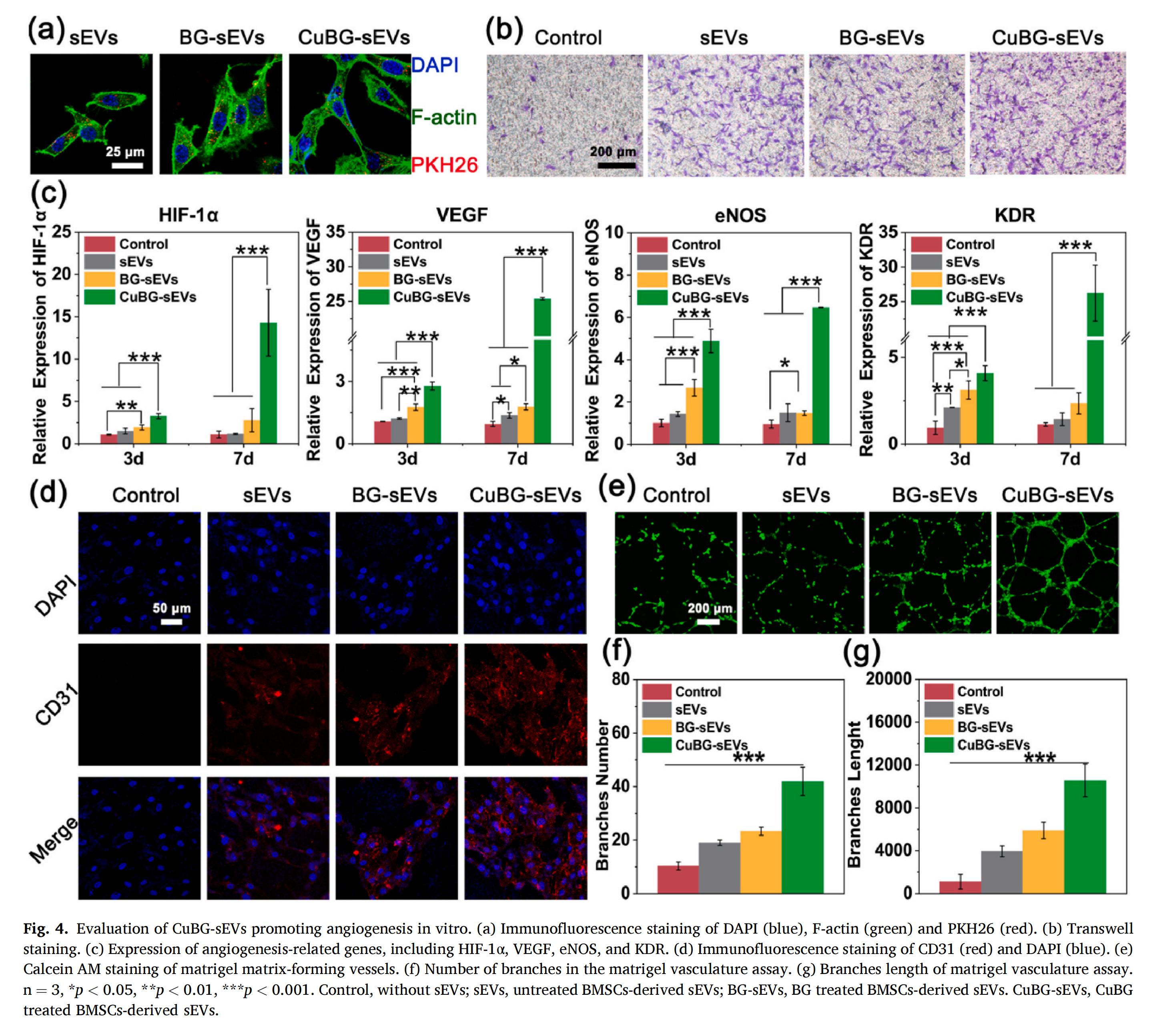 此外,CuBG-sEVs能夠有效上調(diào)包括VEGF、激酶插入結(jié)構(gòu)域受體(KDR)、eNOS以及血小板內(nèi)皮細(xì)胞黏附分子(CD31) 在內(nèi)的多個血管生成關(guān)鍵基因的表達(dá)。在該調(diào)控作用下,細(xì)胞間連接性顯著增強(qiáng),并形成了典型的管狀結(jié)構(gòu),新生血管數(shù)量與血管長度顯著增加,充分證明了CuBG-sEVs在促進(jìn)血管生成方面的顯著效能。