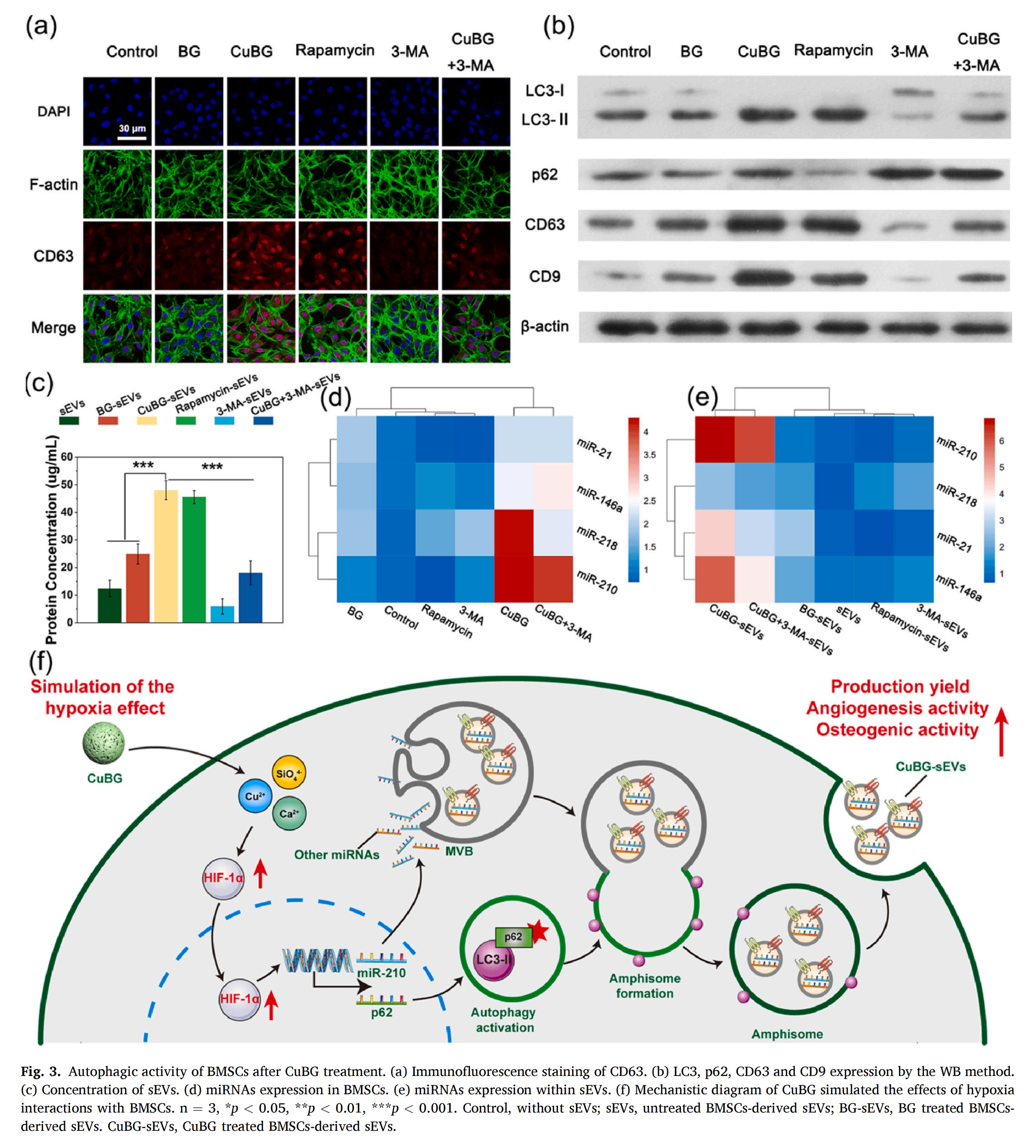 CuBG能釋放Cu2+Ca2+SiO?4-等多種促進(jìn)組織再生的離子,其中,Cu2+通過抑制HIF-1α在細(xì)胞核內(nèi)和核外的降解過程來模擬缺氧效應(yīng),從而激活HIF-1信號通路,并上調(diào)促血管生成miRNA的表達(dá),特別是miR-210。在缺氧條件下,HIF-1α?xí)M(jìn)入細(xì)胞核,激活自噬相關(guān)基因,如微管相關(guān)蛋白1輕鏈3(LC3) 和beclin1,并誘導(dǎo)p62蛋白表達(dá),從而調(diào)控自噬進(jìn)程并增強(qiáng)sEVs的生成。此外,CuBG釋放的Ca2+SiO?4-等其他活性離子,也能夠促進(jìn)成骨相關(guān)miRNA的富集,如miR-218、miR-146a和miR-21。綜上所述,CuBG以HIF-1信號通路及其介導(dǎo)的自噬激活作為核心調(diào)控機(jī)制,有效提升了CuBG-sEVs的產(chǎn)量并增強(qiáng)其成骨活性。
